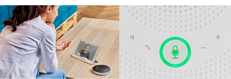 インタラクティブで操作しやすい静電タッチセンサーボタンを採用し、直感的にマイクミュートやボリューム操作が可能です。専用ドライバーのインストール不要なUSBと、NFC機能搭載Bluetoothの二つの接続方法に対応しており、使い方も簡単です。